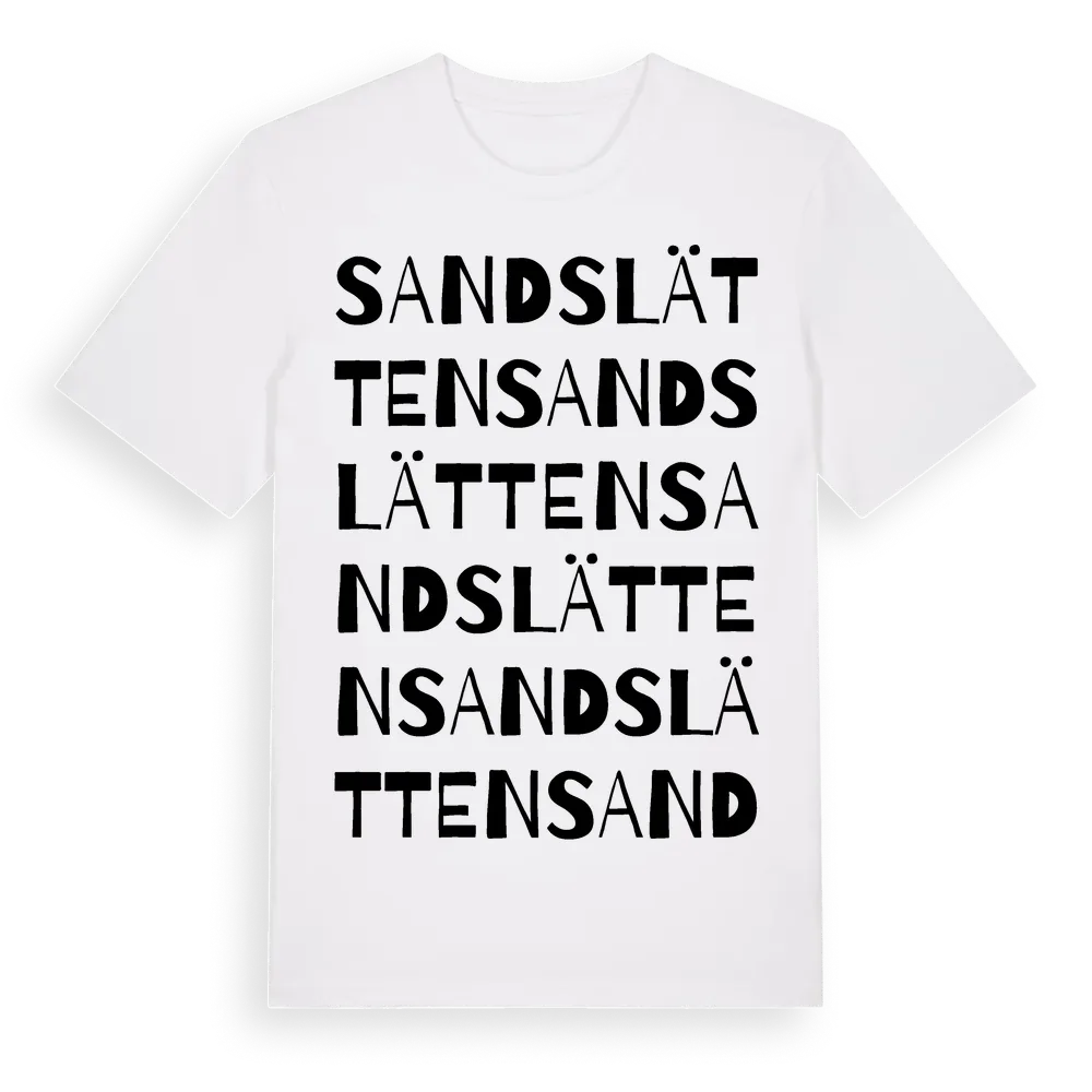 Sandslätten ordlek t-shirt är inspirerad av Sandslätten i Kalmar län, Sverige. Tröjan är designad för dig som har en speciell koppling till platsen – oavsett om du bor här, har rötterna här eller bara älskar Sandslätten.