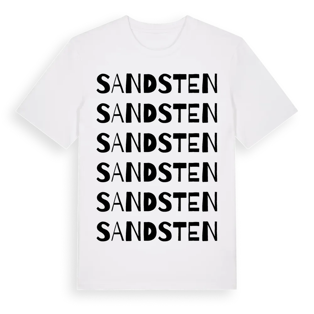 Sandsten ordlek t-shirt är inspirerad av Sandsten i Kalmar län, Sverige. Tröjan är designad för dig som har en speciell koppling till platsen – oavsett om du bor här, har rötterna här eller bara älskar Sandsten.