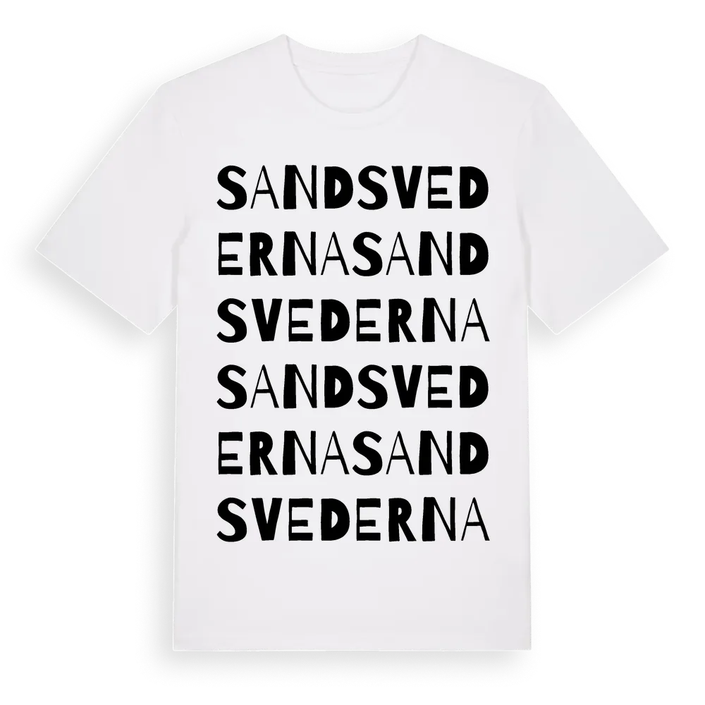 Sandsvederna ordlek t-shirt är inspirerad av Sandsvederna i Kalmar län, Sverige. Tröjan är designad för dig som har en speciell koppling till platsen – oavsett om du bor här, har rötterna här eller bara älskar Sandsvederna.