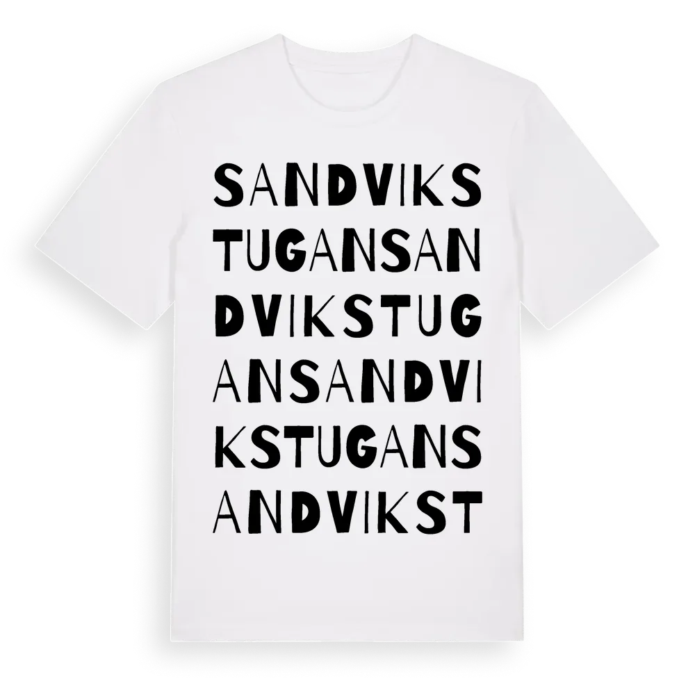 Sandvikstugan ordlek t-shirt är inspirerad av Sandvikstugan i Kalmar län, Sverige. Tröjan är designad för dig som har en speciell koppling till platsen – oavsett om du bor här, har rötterna här eller bara älskar Sandvikstugan.