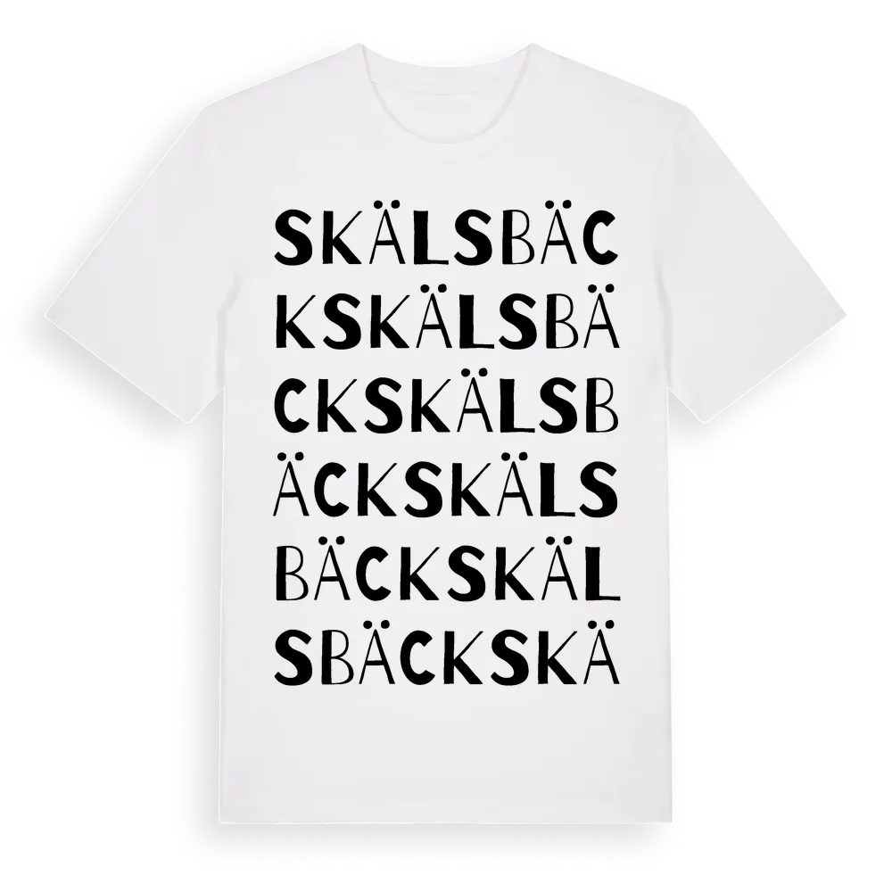 Skälsbäck ordlek t-shirt är inspirerad av byn Skälsbäck i Kalmar län, Sverige. Tröjan är designad för dig som har en speciell koppling till platsen – oavsett om du bor här, har rötterna här eller bara älskar Skälsbäck.