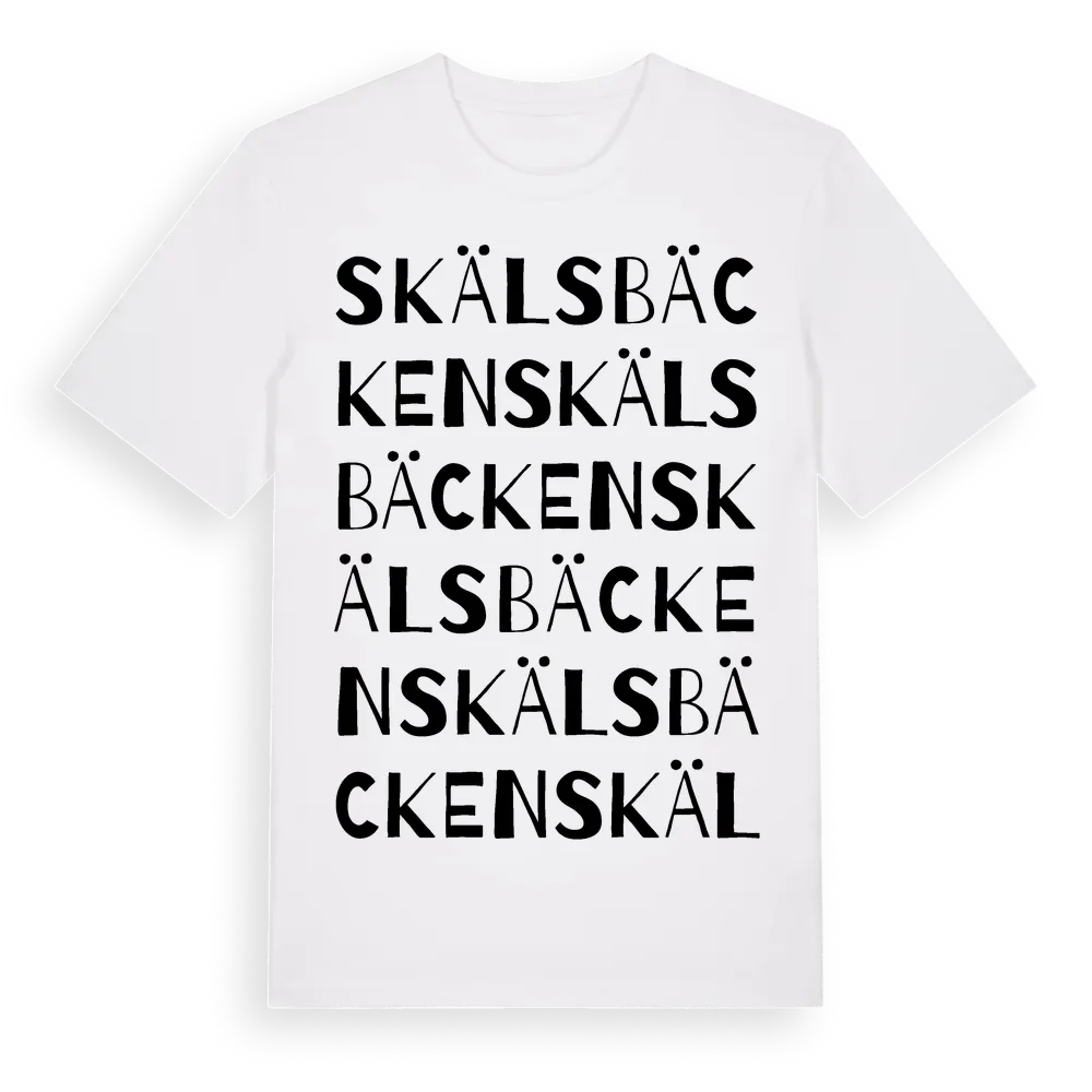 Skälsbäcken ordlek t-shirt är inspirerad av Skälsbäcken i Kalmar län, Sverige. Tröjan är designad för dig som har en speciell koppling till platsen – oavsett om du bor här, har rötterna här eller bara älskar Skälsbäcken.