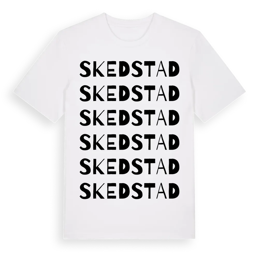 Skedstad ordlek t-shirt är inspirerad av byn Skedstad i Kalmar län, Sverige. Tröjan är designad för dig som har en speciell koppling till platsen – oavsett om du bor här, har rötterna här eller bara älskar Skedstad.