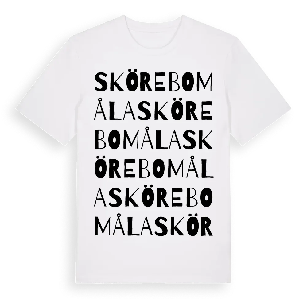 Skörebomåla ordlek t-shirt är inspirerad av byn Skörebomåla i Kalmar län, Sverige. Tröjan är designad för dig som har en speciell koppling till platsen – oavsett om du bor här, har rötterna här eller bara älskar Skörebomåla.
