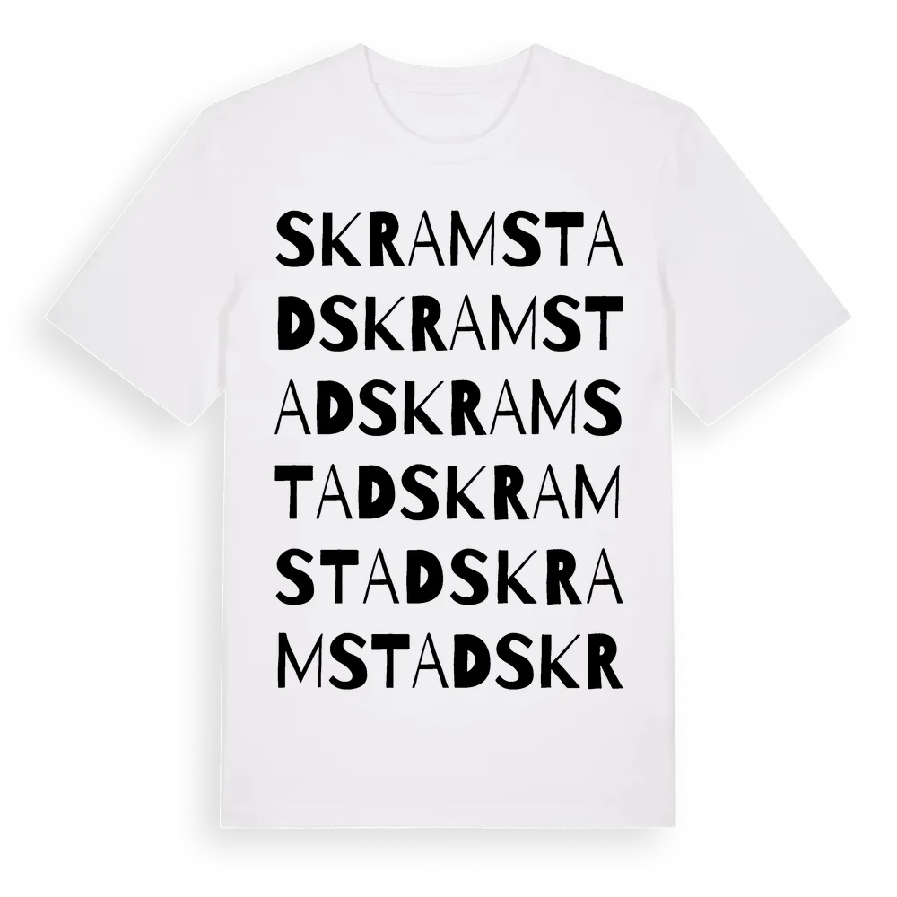 Skramstad ordlek t-shirt är inspirerad av byn Skramstad i Kalmar län, Sverige. Tröjan är designad för dig som har en speciell koppling till platsen – oavsett om du bor här, har rötterna här eller bara älskar Skramstad.