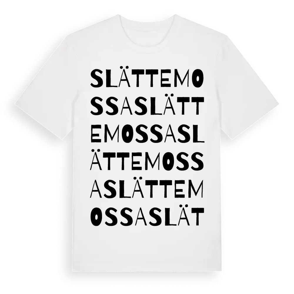 Slättemossa ordlek t-shirt är inspirerad av byn Slättemossa i Kalmar län, Sverige. Tröjan är designad för dig som har en speciell koppling till platsen – oavsett om du bor här, har rötterna här eller bara älskar Slättemossa.
