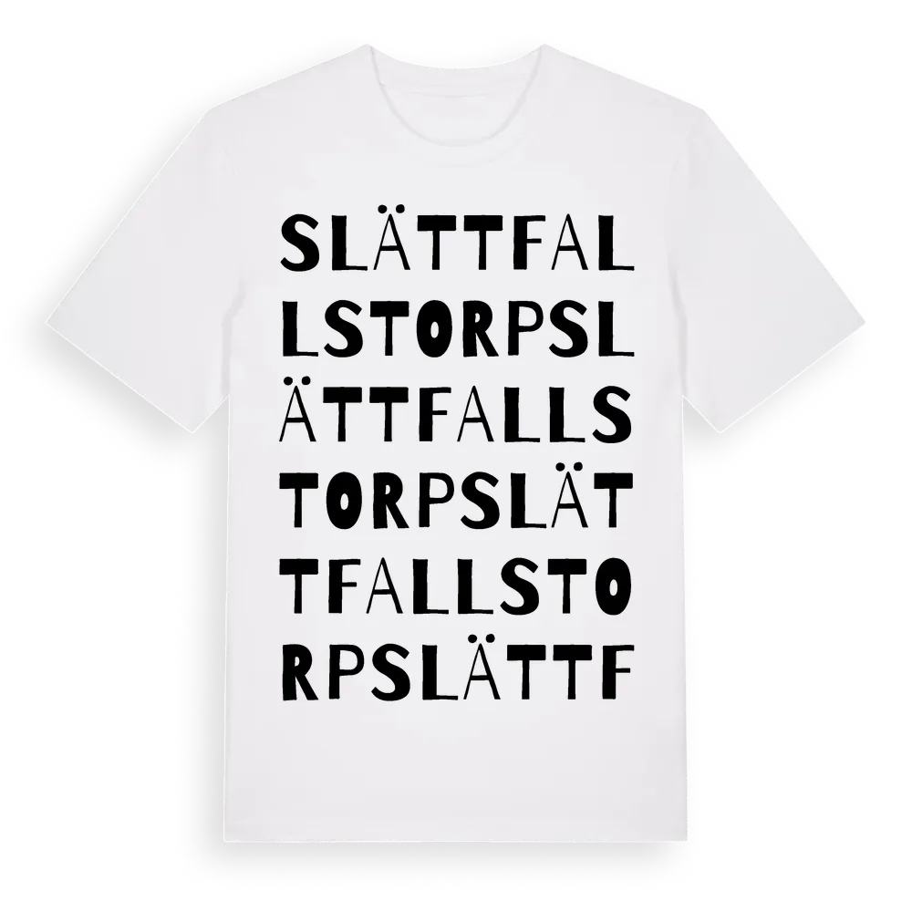 Slättfallstorp ordlek t-shirt är inspirerad av Slättfallstorp i Kalmar län, Sverige. Tröjan är designad för dig som har en speciell koppling till platsen – oavsett om du bor här, har rötterna här eller bara älskar Slättfallstorp.