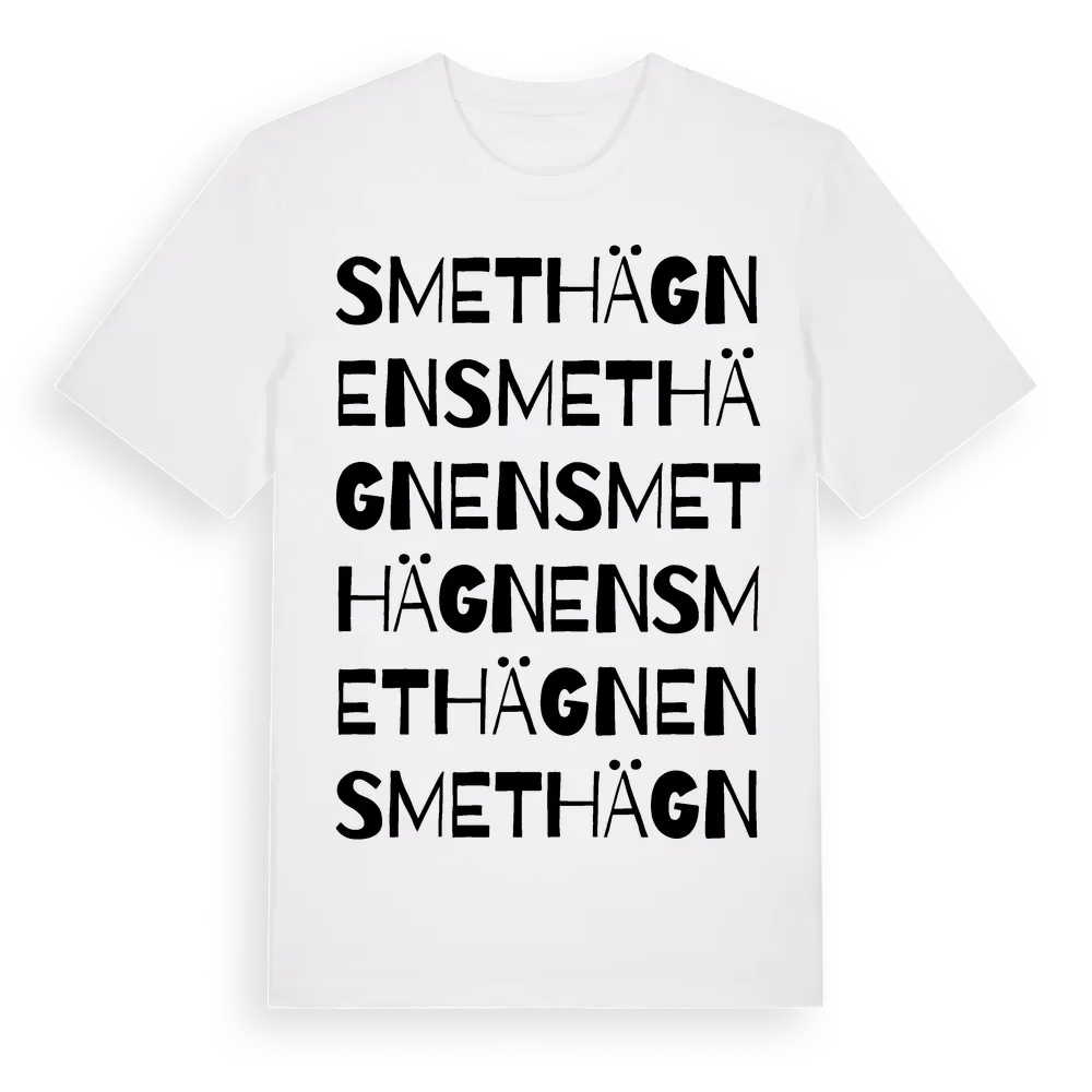 Smethägnen ordlek t-shirt är inspirerad av Smethägnen i Kalmar län, Sverige. Tröjan är designad för dig som har en speciell koppling till platsen – oavsett om du bor här, har rötterna här eller bara älskar Smethägnen.