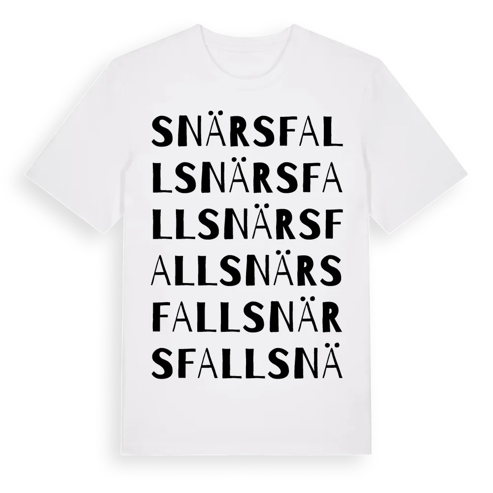 Snärsfall ordlek t-shirt är inspirerad av byn Snärsfall i Kalmar län, Sverige. Tröjan är designad för dig som har en speciell koppling till platsen – oavsett om du bor här, har rötterna här eller bara älskar Snärsfall.