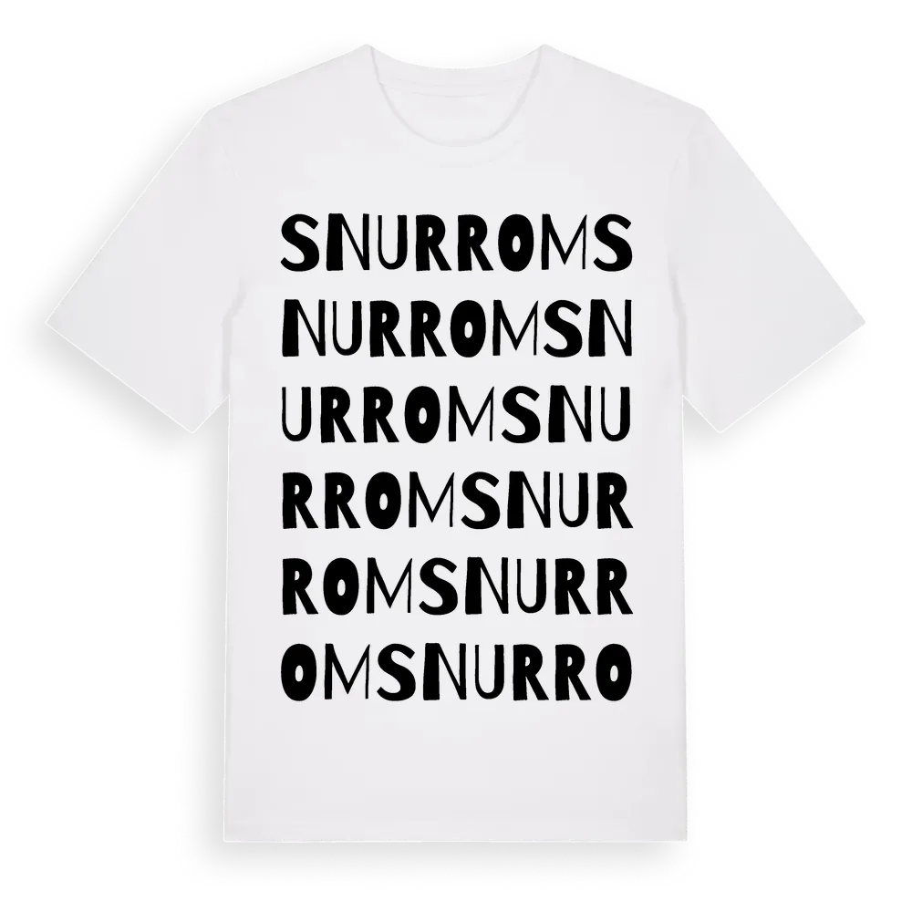 Snurrom ordlek t-shirt är inspirerad av Snurrom i Kalmar län, Sverige. Tröjan är designad för dig som har en speciell koppling till platsen – oavsett om du bor här, har rötterna här eller bara älskar Snurrom.
