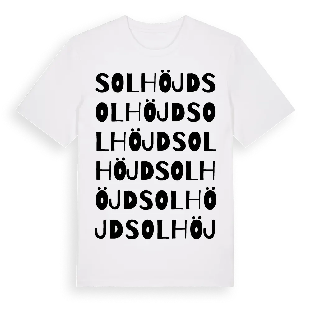 Solhöjd ordlek t-shirt är inspirerad av Solhöjd i Kalmar län, Sverige. Tröjan är designad för dig som har en speciell koppling till platsen – oavsett om du bor här, har rötterna här eller bara älskar Solhöjd.