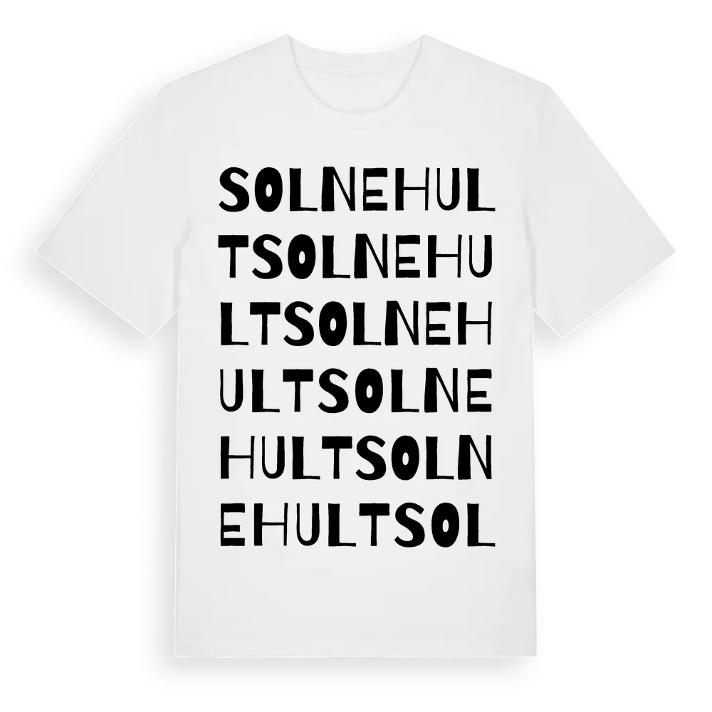 Solnehult ordlek t-shirt är inspirerad av byn Solnehult i Kalmar län, Sverige. Tröjan är designad för dig som har en speciell koppling till platsen – oavsett om du bor här, har rötterna här eller bara älskar Solnehult.