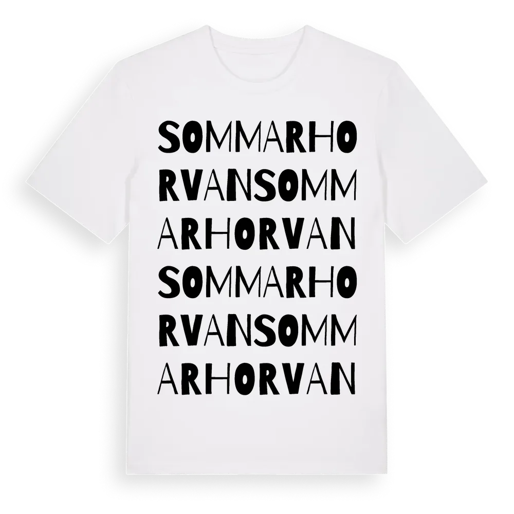 Sommarhorvan ordlek t-shirt är inspirerad av Sommarhorvan i Kalmar län, Sverige. Tröjan är designad för dig som har en speciell koppling till platsen – oavsett om du bor här, har rötterna här eller bara älskar Sommarhorvan.