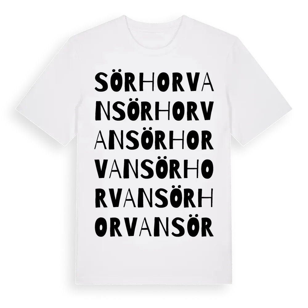 Sörhorvan ordlek t-shirt är inspirerad av Sörhorvan i Kalmar län, Sverige. Tröjan är designad för dig som har en speciell koppling till platsen – oavsett om du bor här, har rötterna här eller bara älskar Sörhorvan.