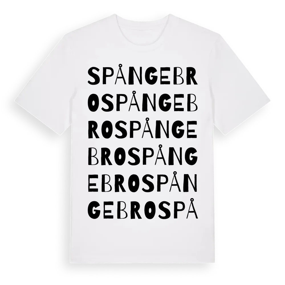 Spångebro ordlek t-shirt är inspirerad av byn Spångebro i Kalmar län, Sverige. Tröjan är designad för dig som har en speciell koppling till platsen – oavsett om du bor här, har rötterna här eller bara älskar Spångebro.