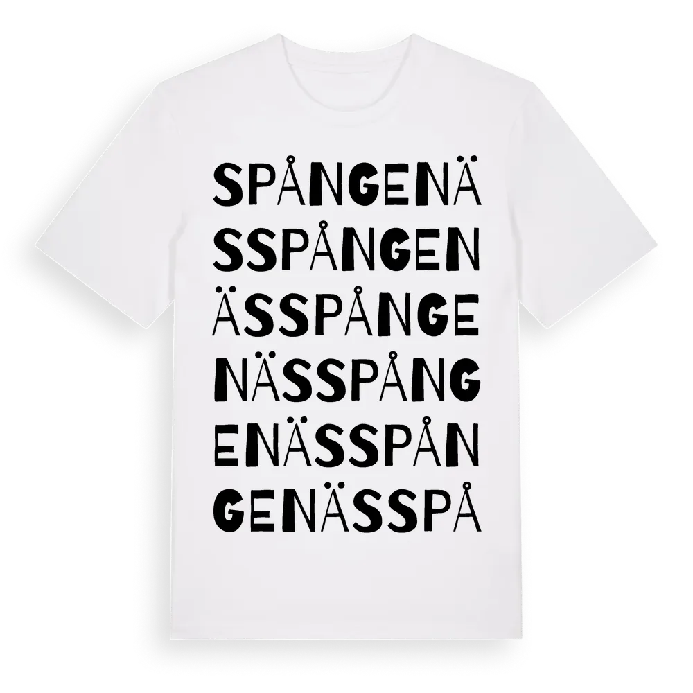 Spångenäs ordlek t-shirt är inspirerad av byn Spångenäs i Kalmar län, Sverige. Tröjan är designad för dig som har en speciell koppling till platsen – oavsett om du bor här, har rötterna här eller bara älskar Spångenäs.