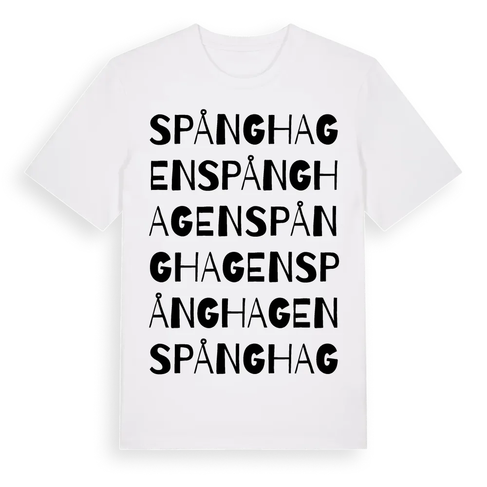 Spånghagen ordlek t-shirt är inspirerad av Spånghagen i Kalmar län, Sverige. Tröjan är designad för dig som har en speciell koppling till platsen – oavsett om du bor här, har rötterna här eller bara älskar Spånghagen.
