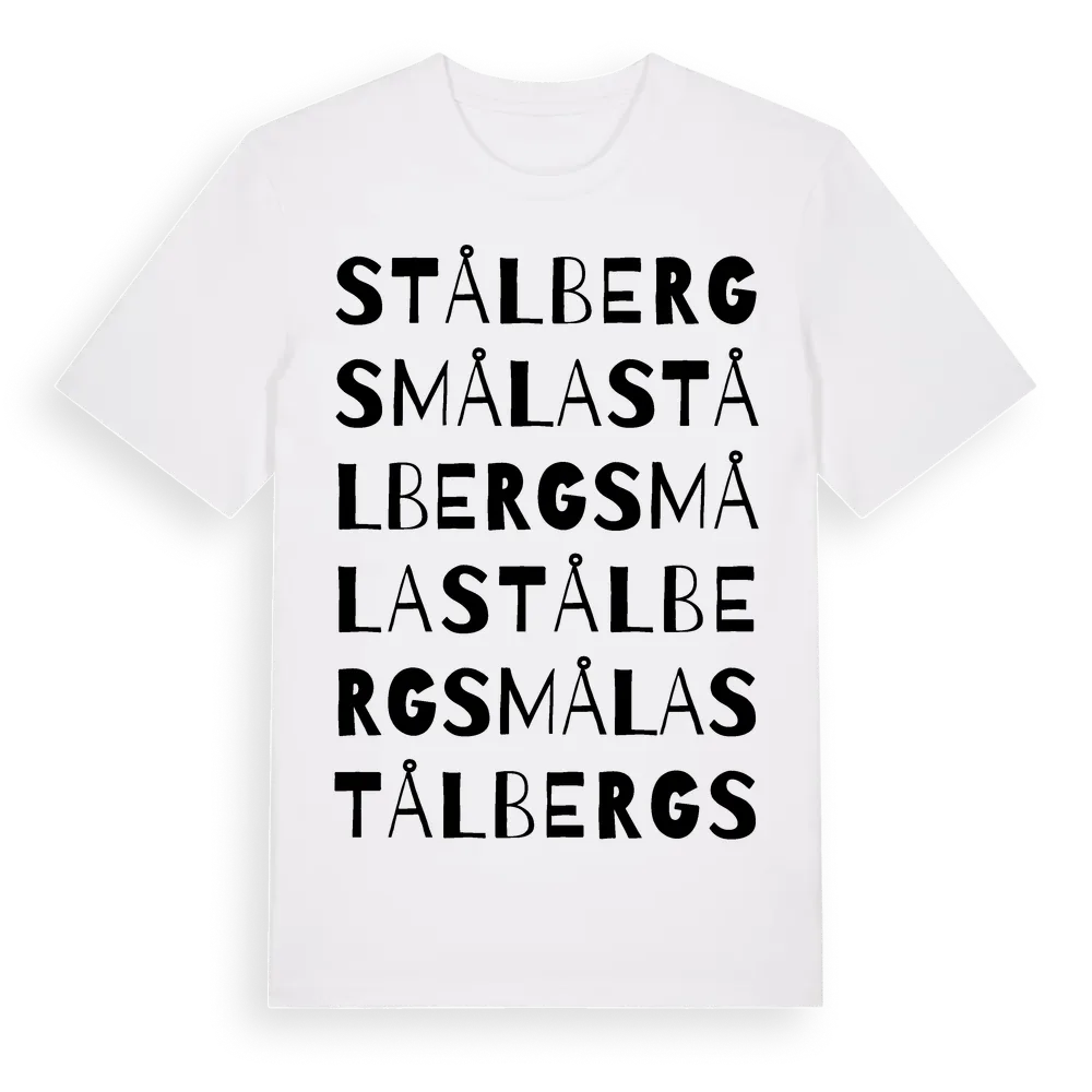 Stålbergsmåla ordlek t-shirt är inspirerad av Stålbergsmåla i Kalmar län, Sverige. Tröjan är designad för dig som har en speciell koppling till platsen – oavsett om du bor här, har rötterna här eller bara älskar Stålbergsmåla.