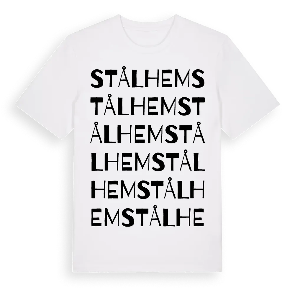 Stålhem ordlek t-shirt är inspirerad av Stålhem i Kalmar län, Sverige. Tröjan är designad för dig som har en speciell koppling till platsen – oavsett om du bor här, har rötterna här eller bara älskar Stålhem.