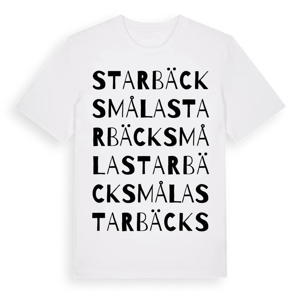 Starbäcksmåla ordlek t-shirt är inspirerad av Starbäcksmåla i Kalmar län, Sverige. Tröjan är designad för dig som har en speciell koppling till platsen – oavsett om du bor här, har rötterna här eller bara älskar Starbäcksmåla.
