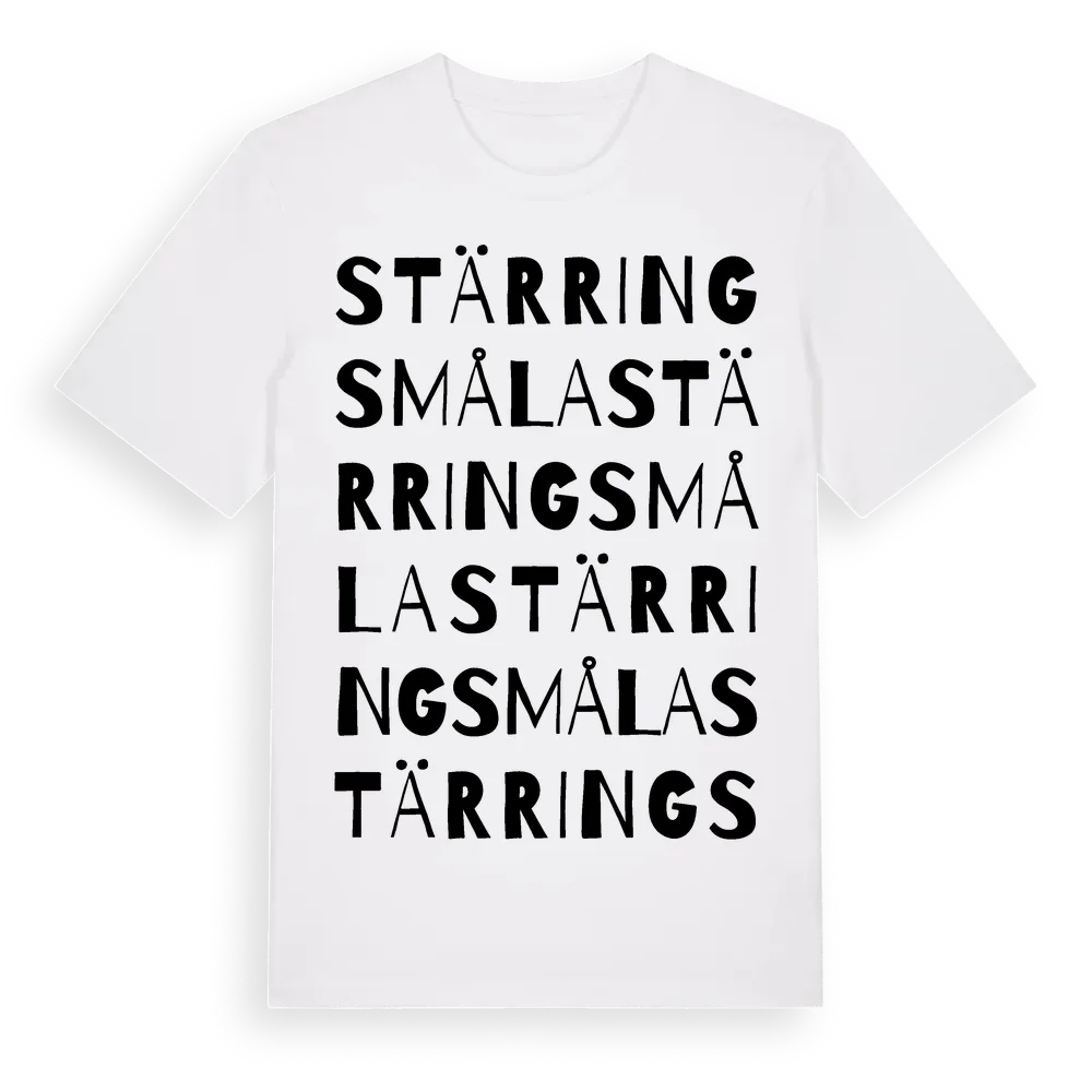 Stärringsmåla ordlek t-shirt är inspirerad av Stärringsmåla i Kalmar län, Sverige. Tröjan är designad för dig som har en speciell koppling till platsen – oavsett om du bor här, har rötterna här eller bara älskar Stärringsmåla.