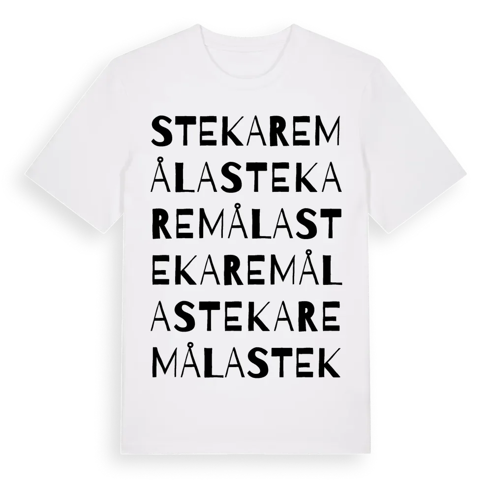 Stekaremåla ordlek t-shirt är inspirerad av byn Stekaremåla i Kalmar län, Sverige. Tröjan är designad för dig som har en speciell koppling till platsen – oavsett om du bor här, har rötterna här eller bara älskar Stekaremåla.