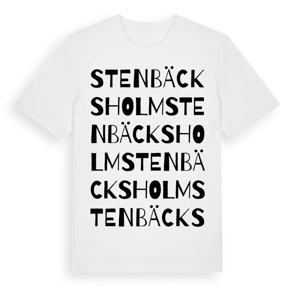Stenbäcksholm ordlek t-shirt är inspirerad av Stenbäcksholm i Kalmar län, Sverige. Tröjan är designad för dig som har en speciell koppling till platsen – oavsett om du bor här, har rötterna här eller bara älskar Stenbäcksholm.