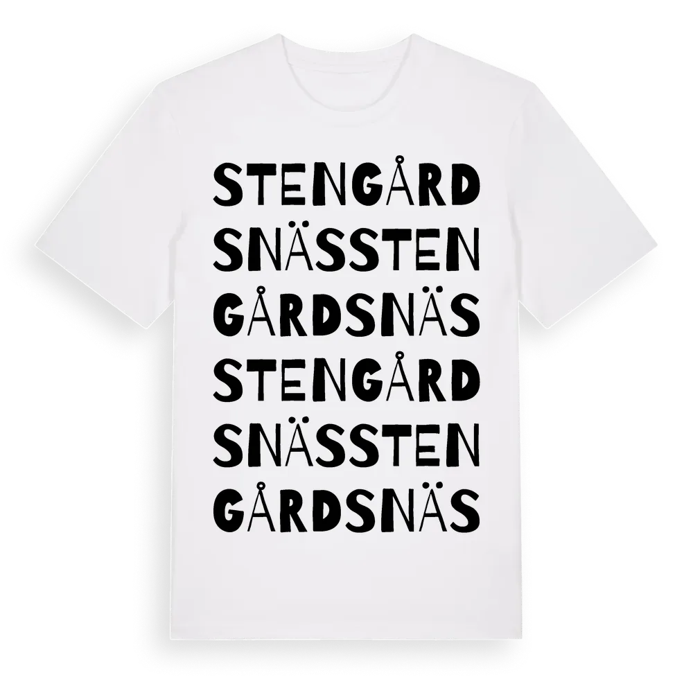 Stengårdsnäs ordlek t-shirt är inspirerad av byn Stengårdsnäs i Kalmar län, Sverige. Tröjan är designad för dig som har en speciell koppling till platsen – oavsett om du bor här, har rötterna här eller bara älskar Stengårdsnäs.