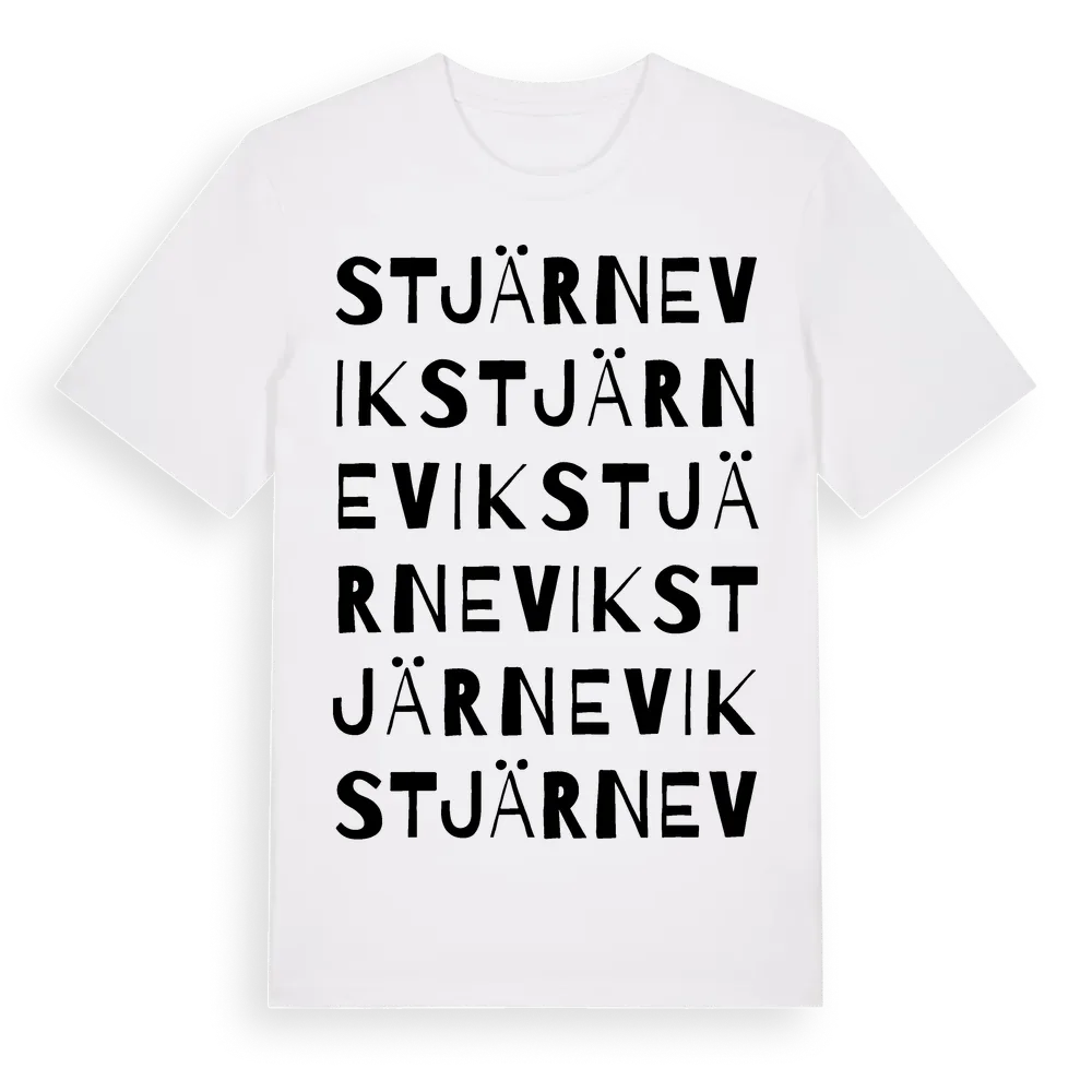 Stjärnevik ordlek t-shirt är inspirerad av byn Stjärnevik i Kalmar län, Sverige. Tröjan är designad för dig som har en speciell koppling till platsen – oavsett om du bor här, har rötterna här eller bara älskar Stjärnevik.