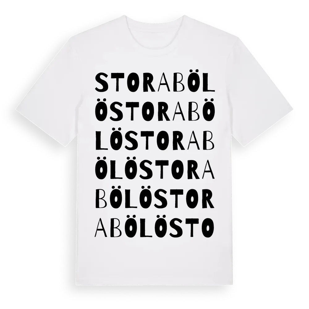 Stora Bölö ordlek t-shirt är inspirerad av byn Stora Bölö i Kalmar län, Sverige. Tröjan är designad för dig som har en speciell koppling till platsen – oavsett om du bor här, har rötterna här eller bara älskar Stora Bölö.