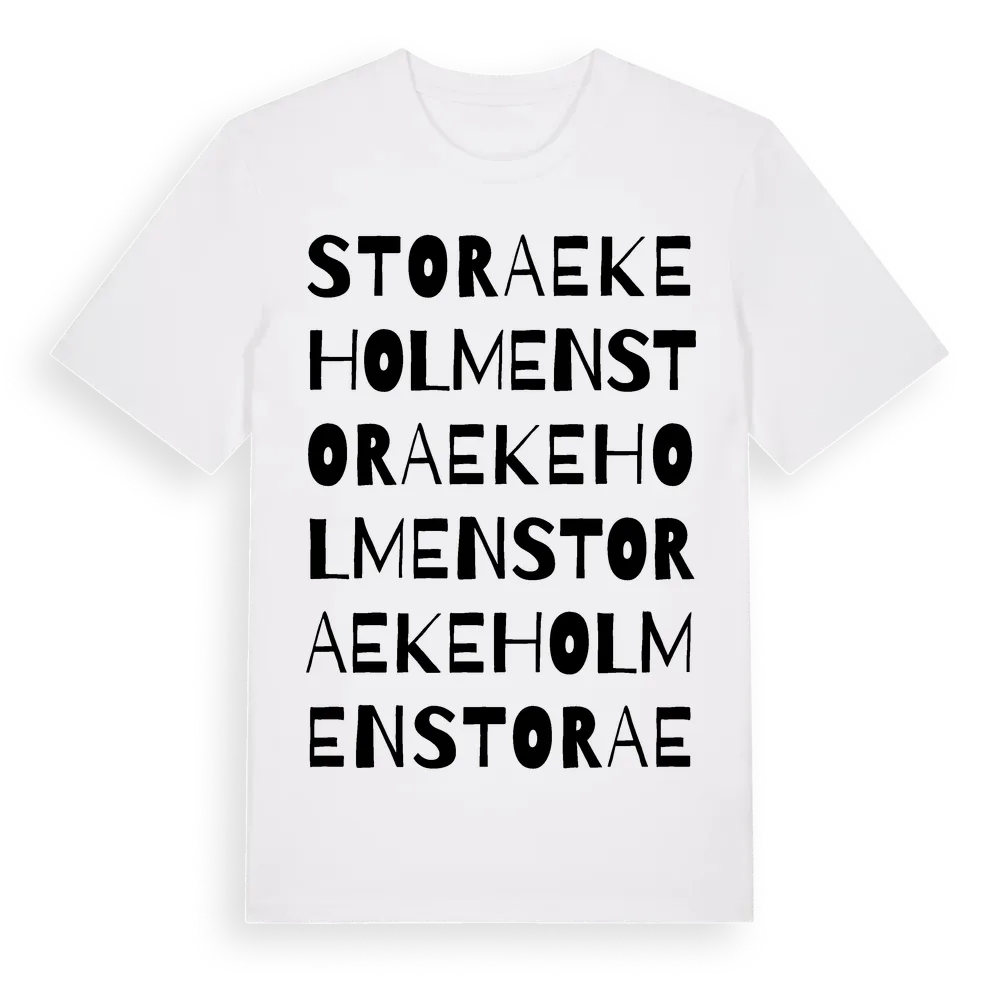 Stora Ekeholmen ordlek t-shirt är inspirerad av ön Stora Ekeholmen i Kalmar län, Sverige. Tröjan är designad för dig som har en speciell koppling till platsen – oavsett om du bor här, har rötterna här eller bara älskar Stora Ekeholmen.