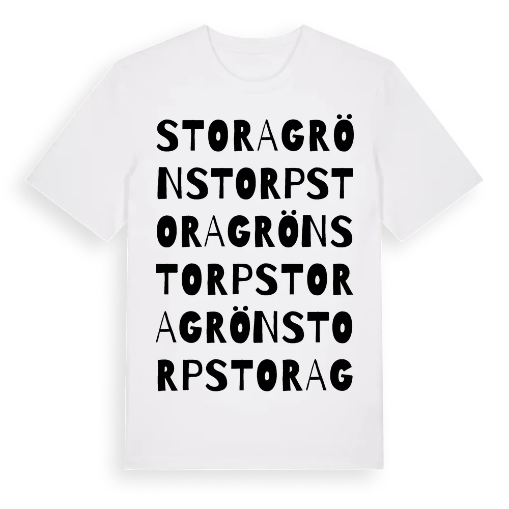 Stora Grönstorp ordlek t-shirt är inspirerad av Stora Grönstorp i Kalmar län, Sverige. Tröjan är designad för dig som har en speciell koppling till platsen – oavsett om du bor här, har rötterna här eller bara älskar Stora Grönstorp.