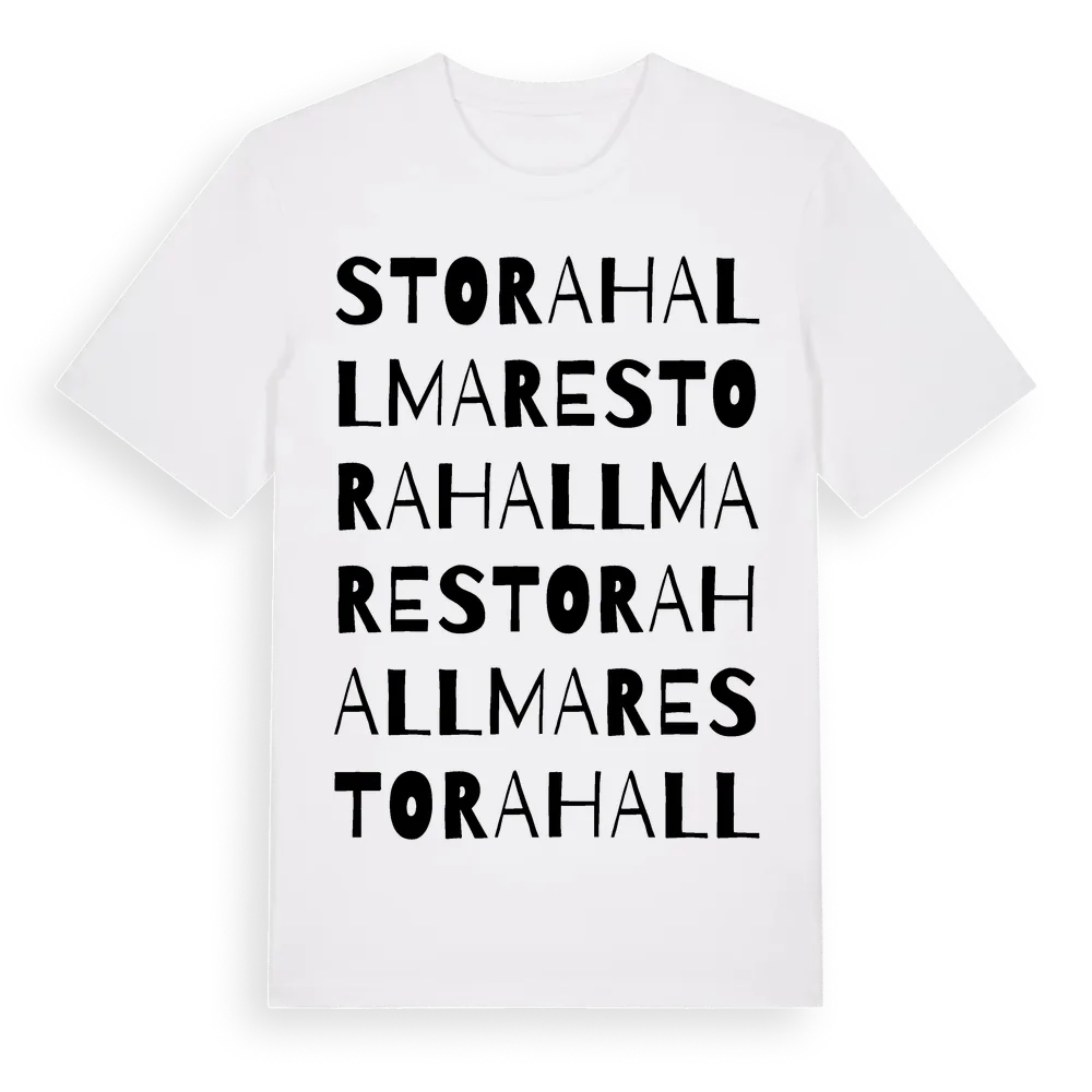 Stora Hallmare ordlek t-shirt är inspirerad av byn Stora Hallmare i Kalmar län, Sverige. Tröjan är designad för dig som har en speciell koppling till platsen – oavsett om du bor här, har rötterna här eller bara älskar Stora Hallmare.