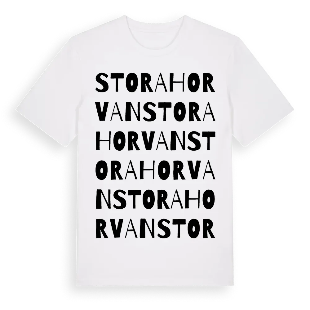 Stora Horvan ordlek t-shirt är inspirerad av Stora Horvan i Kalmar län, Sverige. Tröjan är designad för dig som har en speciell koppling till platsen – oavsett om du bor här, har rötterna här eller bara älskar Stora Horvan.