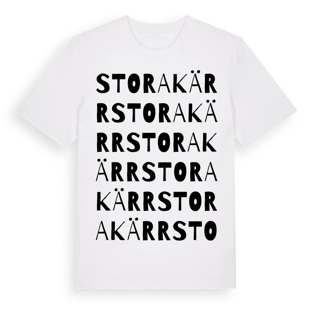 Stora Kärr ordlek t-shirt är inspirerad av Stora Kärr i Kalmar län, Sverige. Tröjan är designad för dig som har en speciell koppling till platsen – oavsett om du bor här, har rötterna här eller bara älskar Stora Kärr.