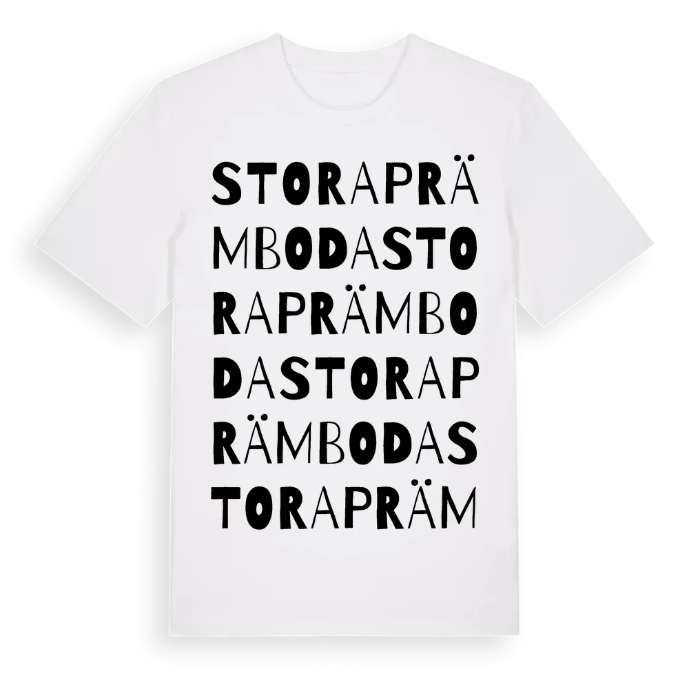 Stora Prämboda ordlek t-shirt är inspirerad av byn Stora Prämboda i Kalmar län, Sverige. Tröjan är designad för dig som har en speciell koppling till platsen – oavsett om du bor här, har rötterna här eller bara älskar Stora Prämboda.