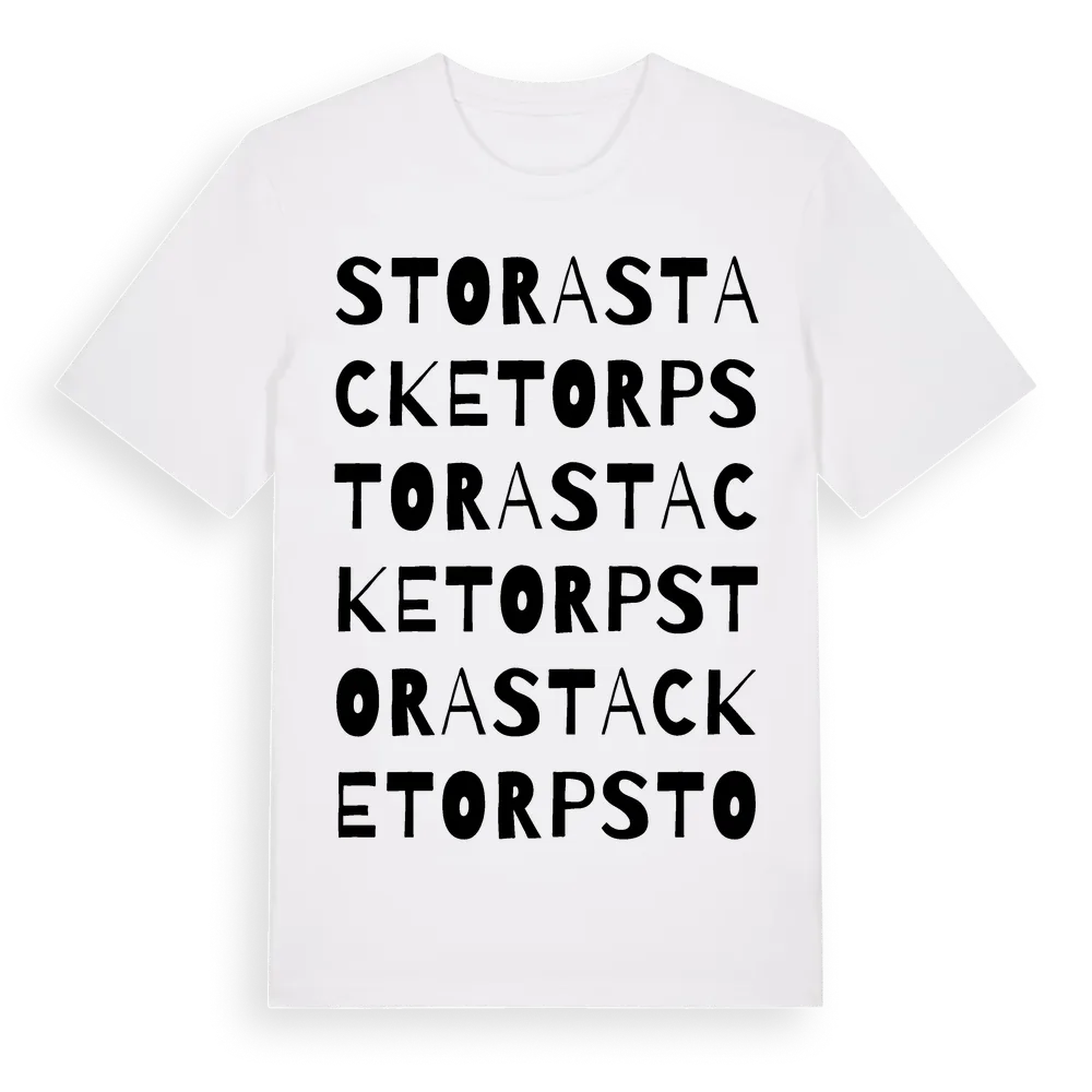 Stora Stacketorp ordlek t-shirt är inspirerad av byn Stora Stacketorp i Kalmar län, Sverige. Tröjan är designad för dig som har en speciell koppling till platsen – oavsett om du bor här, har rötterna här eller bara älskar Stora Stacketorp.