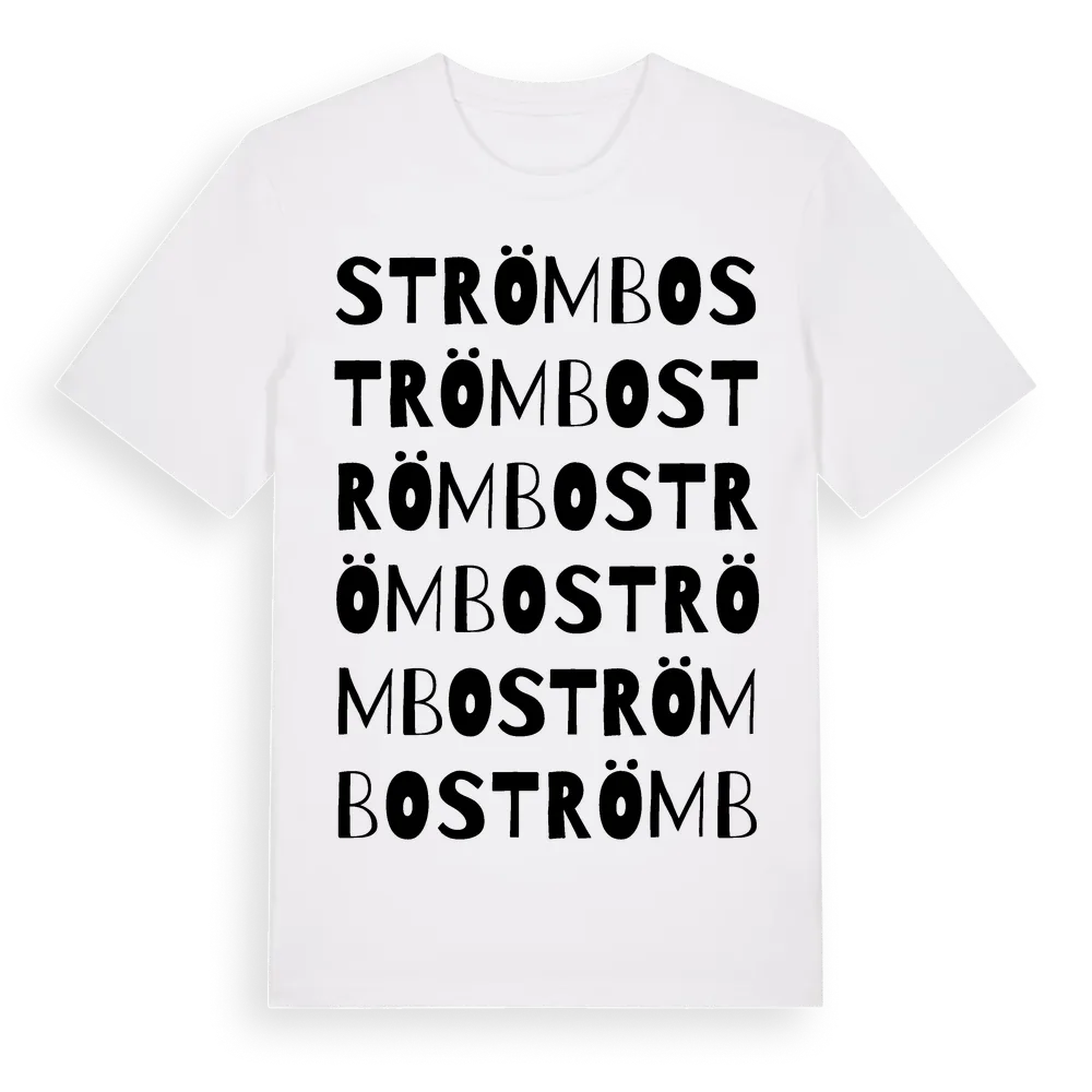 Strömbo ordlek t-shirt är inspirerad av byn Strömbo i Kalmar län, Sverige. Tröjan är designad för dig som har en speciell koppling till platsen – oavsett om du bor här, har rötterna här eller bara älskar Strömbo.