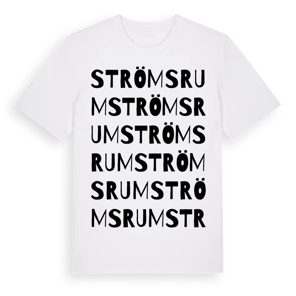 Strömsrum ordlek t-shirt är inspirerad av Strömsrum i Kalmar län, Sverige. Tröjan är designad för dig som har en speciell koppling till platsen – oavsett om du bor här, har rötterna här eller bara älskar Strömsrum.