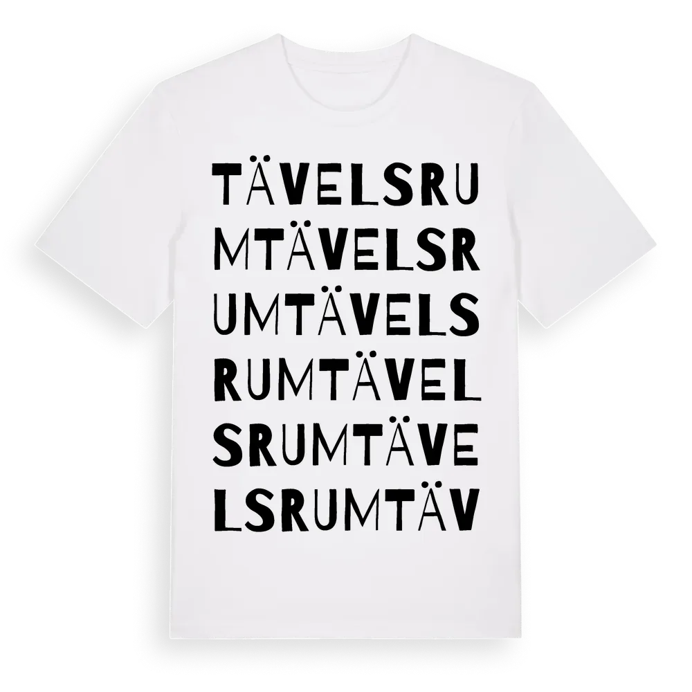 Tävelsrum ordlek t-shirt är inspirerad av byn Tävelsrum i Kalmar län, Sverige. Tröjan är designad för dig som har en speciell koppling till platsen – oavsett om du bor här, har rötterna här eller bara älskar Tävelsrum.