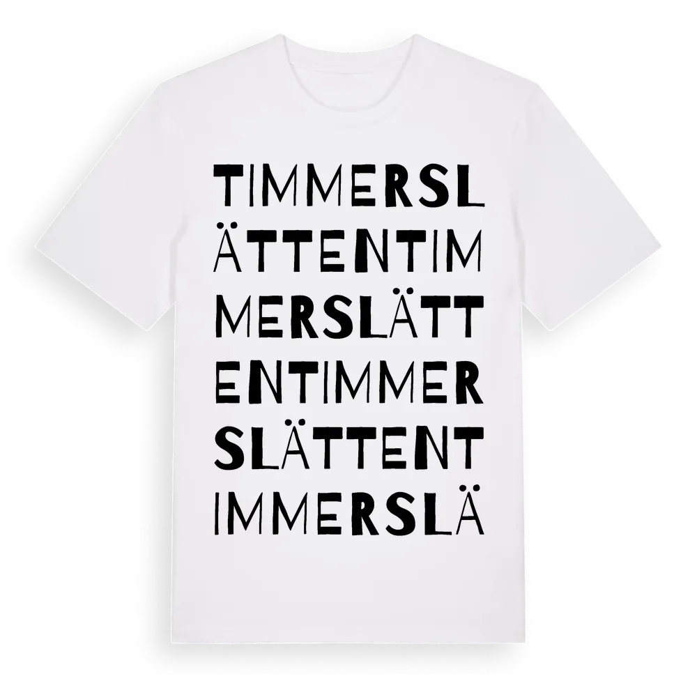 Timmerslätten ordlek t-shirt är inspirerad av Timmerslätten i Kalmar län, Sverige. Tröjan är designad för dig som har en speciell koppling till platsen – oavsett om du bor här, har rötterna här eller bara älskar Timmerslätten.