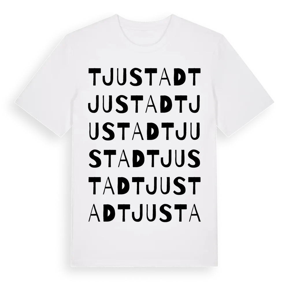 Tjustad ordlek t-shirt är inspirerad av byn Tjustad i Kalmar län, Sverige. Tröjan är designad för dig som har en speciell koppling till platsen – oavsett om du bor här, har rötterna här eller bara älskar Tjustad.
