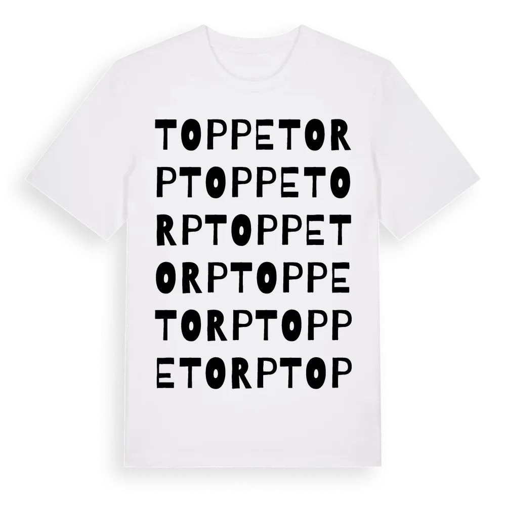 Toppetorp ordlek t-shirt är inspirerad av Toppetorp i Kalmar län, Sverige. Tröjan är designad för dig som har en speciell koppling till platsen – oavsett om du bor här, har rötterna här eller bara älskar Toppetorp.