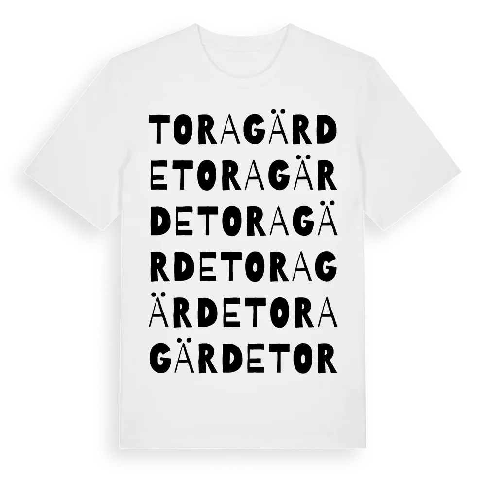 Toragärde ordlek t-shirt är inspirerad av byn Toragärde i Kalmar län, Sverige. Tröjan är designad för dig som har en speciell koppling till platsen – oavsett om du bor här, har rötterna här eller bara älskar Toragärde.