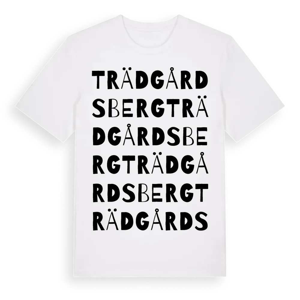 Trädgårdsberg ordlek t-shirt är inspirerad av Trädgårdsberg i Kalmar län, Sverige. Tröjan är designad för dig som har en speciell koppling till platsen – oavsett om du bor här, har rötterna här eller bara älskar Trädgårdsberg.