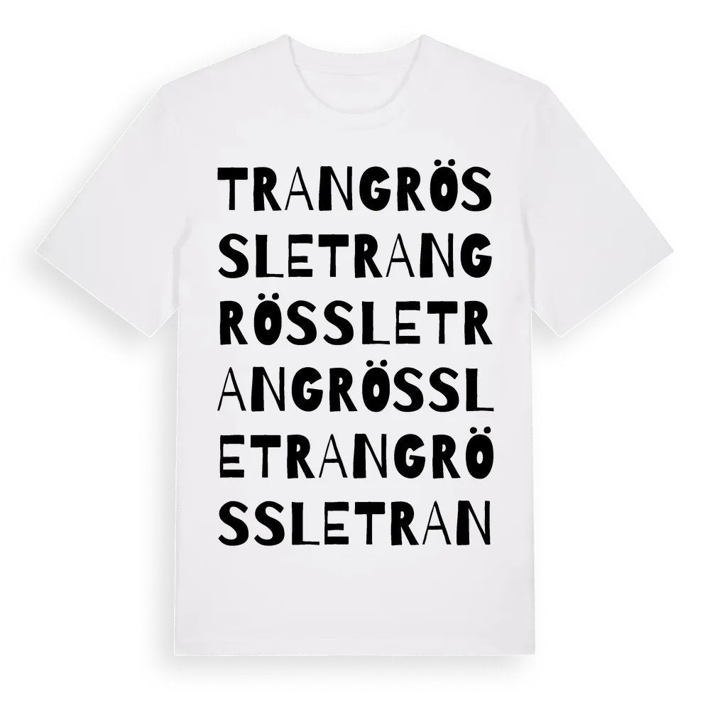 Trangrössle ordlek t-shirt är inspirerad av Trangrössle i Kalmar län, Sverige. Tröjan är designad för dig som har en speciell koppling till platsen – oavsett om du bor här, har rötterna här eller bara älskar Trangrössle.