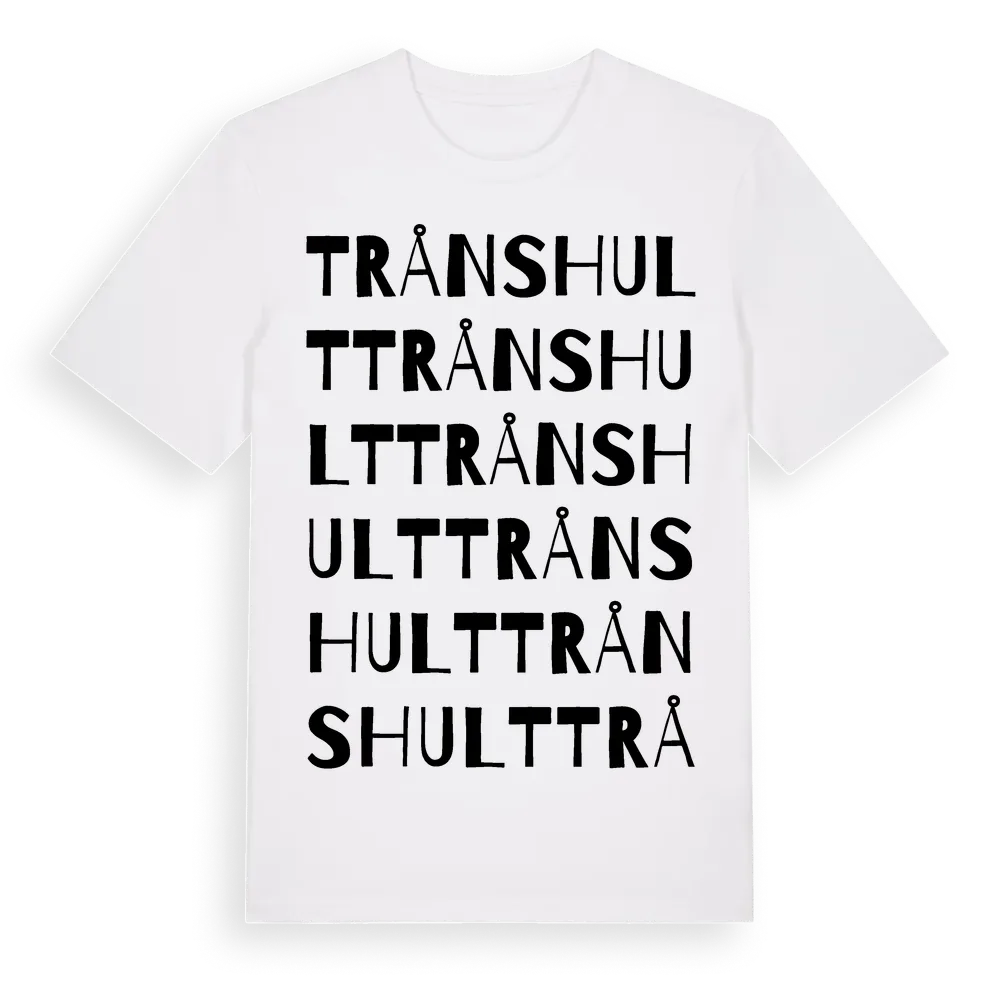 Trånshult ordlek t-shirt är inspirerad av byn Trånshult i Kalmar län, Sverige. Tröjan är designad för dig som har en speciell koppling till platsen – oavsett om du bor här, har rötterna här eller bara älskar Trånshult.