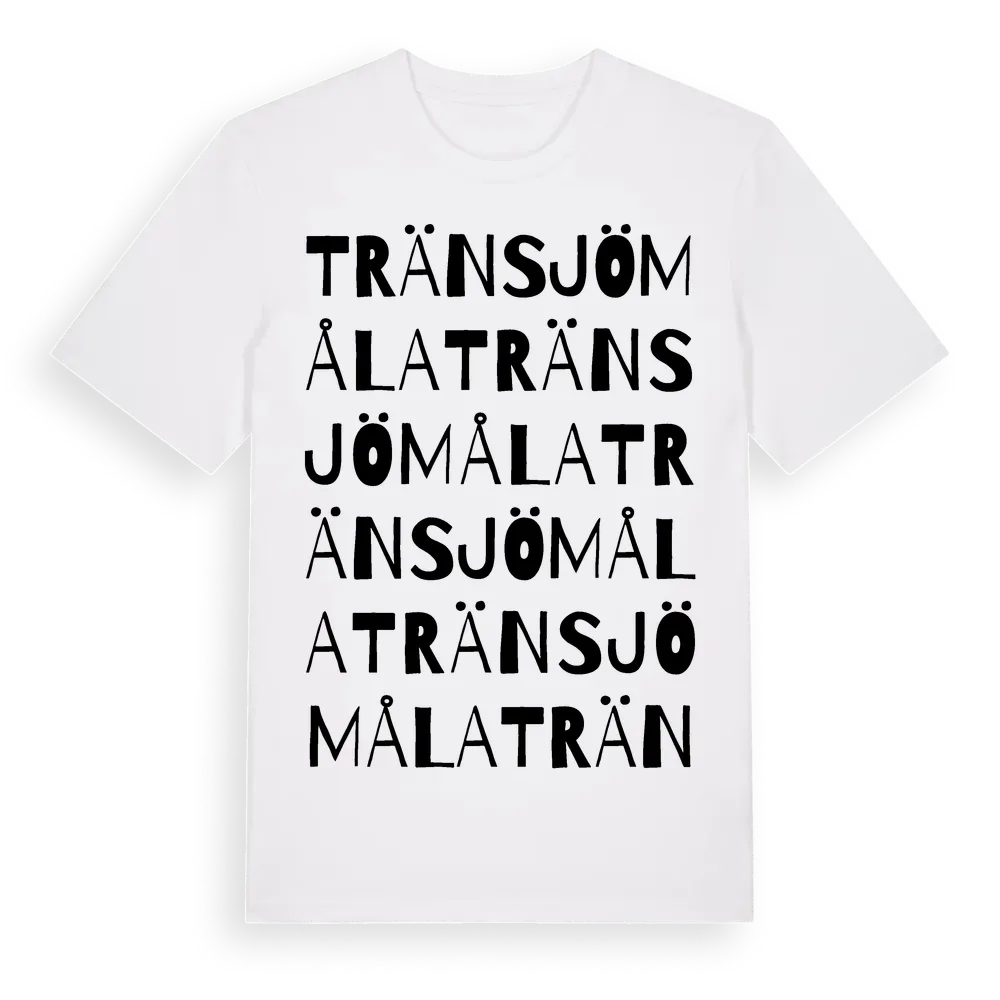 Tränsjömåla ordlek t-shirt är inspirerad av byn Tränsjömåla i Kalmar län, Sverige. Tröjan är designad för dig som har en speciell koppling till platsen – oavsett om du bor här, har rötterna här eller bara älskar Tränsjömåla.