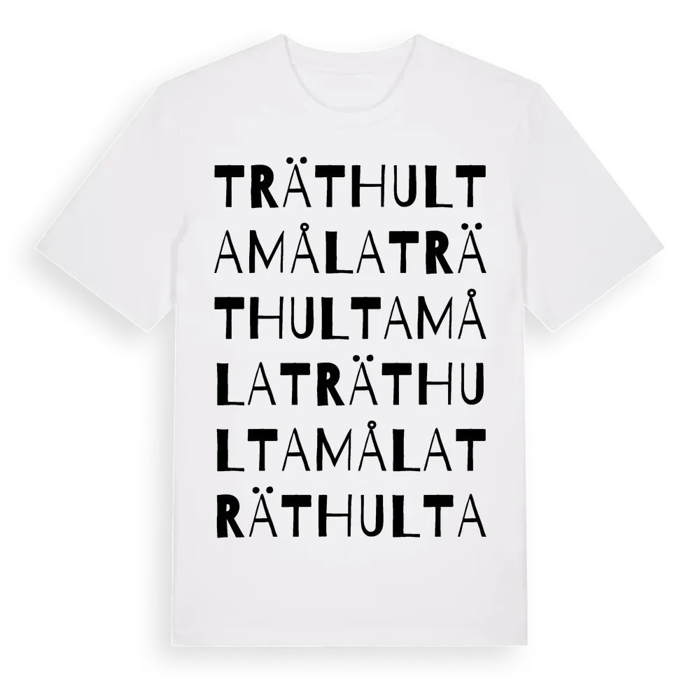 Träthultamåla ordlek t-shirt är inspirerad av byn Träthultamåla i Kalmar län, Sverige. Tröjan är designad för dig som har en speciell koppling till platsen – oavsett om du bor här, har rötterna här eller bara älskar Träthultamåla.