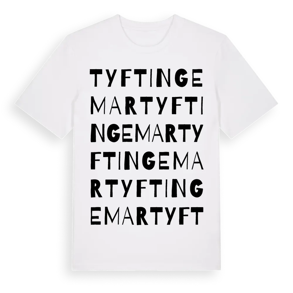 Tyftingemar ordlek t-shirt är inspirerad av byn Tyftingemar i Kalmar län, Sverige. Tröjan är designad för dig som har en speciell koppling till platsen – oavsett om du bor här, har rötterna här eller bara älskar Tyftingemar.